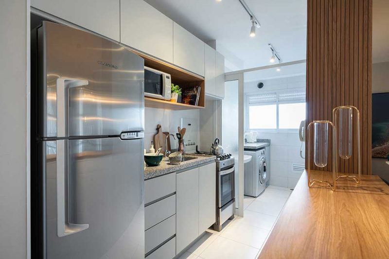 Uma cozinha de apartamento pequeno tem se tornado com o passar dos anos em um cômodo multifuncional, no qual a família não só faz as refeições diárias, mas também se divertem, planejam seu dia e assistem tv.