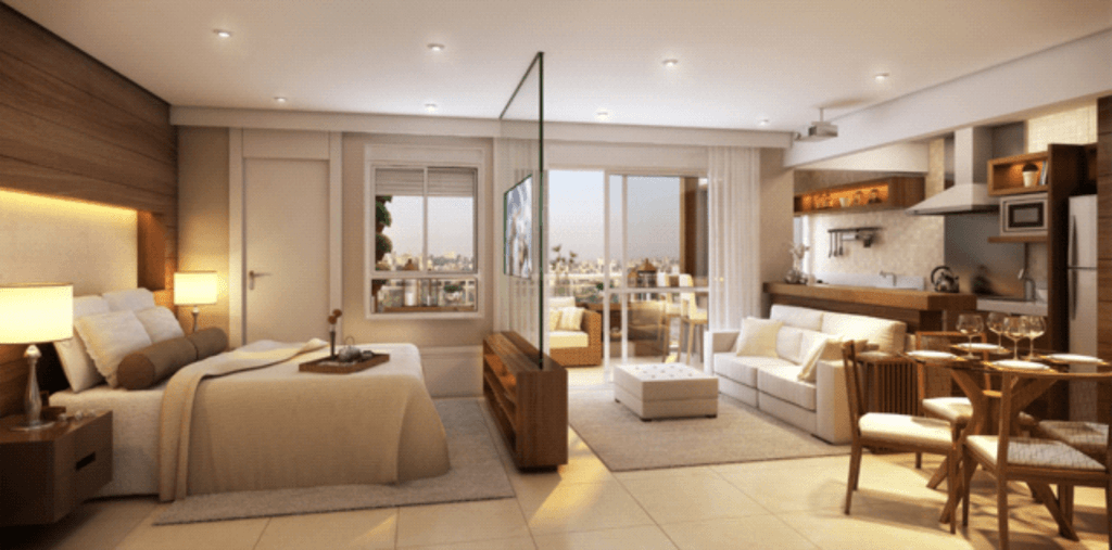 Download Quarto E Sala Juntos Pequeno Simples PNG. Quarto de casal pequeno em conjunto com a sala. Muebles simples y en colores sobrios son la mejor opción para decorar un interior moderno.